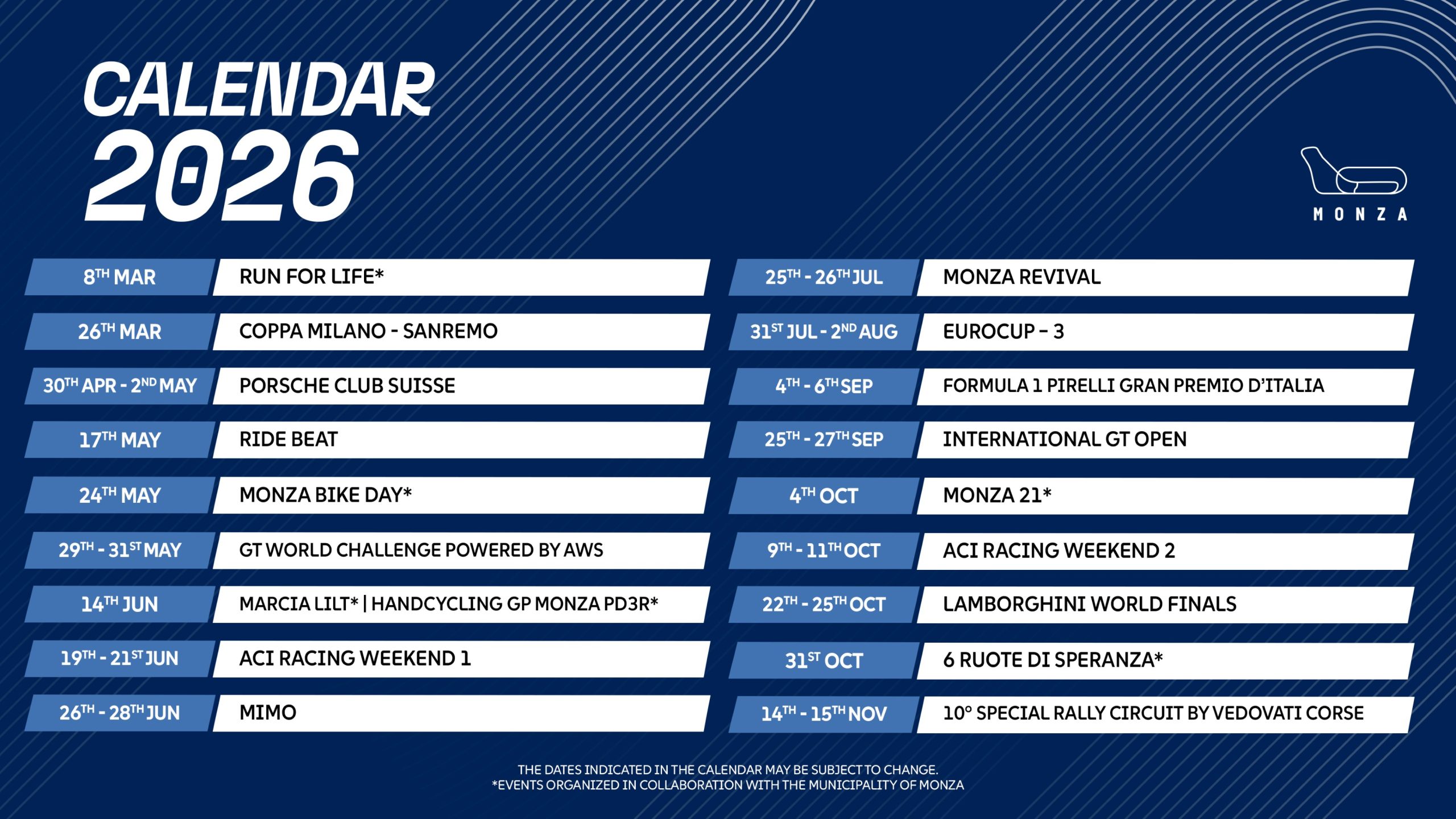 La stagione prenderà il via il 26 marzo quando l’Autodromo ospiterà il prologo della Milano-Sanremo, gara di regolarità di grande fascino riservata alle auto storiche. Nel celebre impianto brianzolo si terranno le verifiche tecniche e sportive e le prime speciali, il cui percorso comprenderà anche l’iconico Anello Alta Velocità.